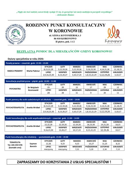 Rodzinny Punkt Konsultacyjny w Koronowie oferuje bezpłatną pomoc dla mieszkańców #Gminy Koronowo w zakresie: porad radcy prawnego, pomocy psychologa, psychoterapeuty oraz psychiatry.