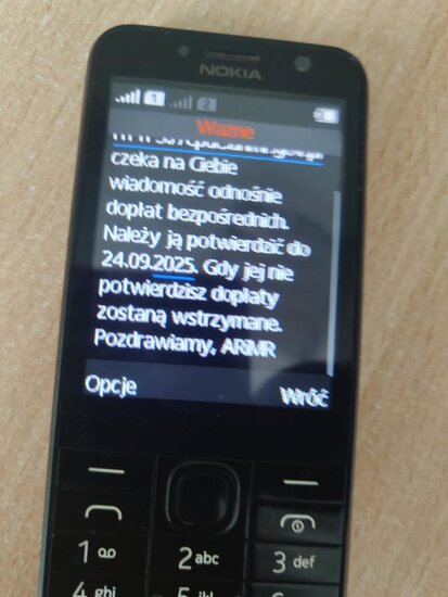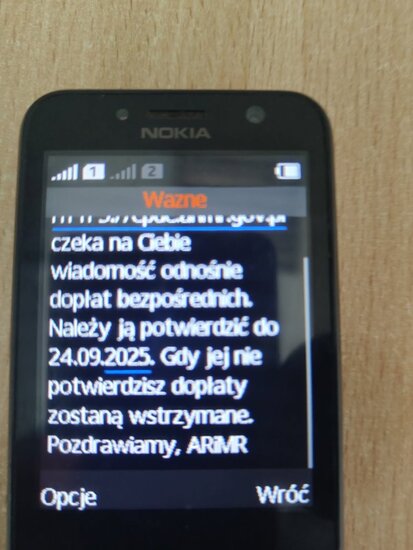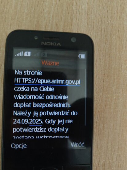 W ostatnim czasie obserwujemy wzmożoną #aktywność kampanii phishingowych rozsyłanych SMS-ami do naszych beneficjentów. Wiadomości te pochodzą od nadawców „Tajne” oraz „Ważne” i często zawierają treści mające wywołać presję czasu (np. zablokowanie dopłat na 2025 rok, jeśli nie zaloguje się w przeciągu 12h przez link podany w SMS) a następnie kierują do fałszywych stron logowania.