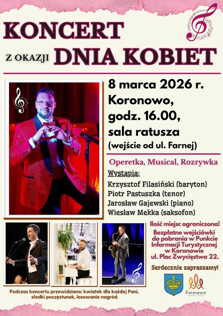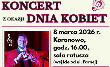Burmistrz Koronowa Patryk Mikołajewski serdecznie zaprasza na koncert z #okazji Dnia Kobiet, który odbędzie się w niedzielę, 8 marca 2026 r. o godz. 16.00 w sali ratusza (wejście od ul. Farnej).