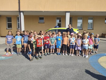 Podczas dzisiejszego (5.09.2025) spotkania policjantka przypomniała młodym słuchaczom o obowiązku korzystania z elementów odblaskowych oraz obowiązku jeżdżenia w fotelikach z zapiętymi pasami.