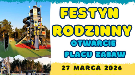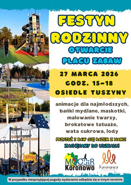 Zapraszamy na Festyn Rodzinny połączony z otwarciem placu zabaw na osiedlu #Tuszyny, który odbędzie się 27 marca 2026 r. w godzinach 15 - 18. Szczegóły na plakacie.