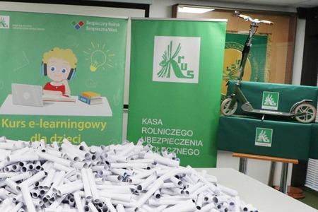 7 listopada w Centrali Kasy Rolniczego# Ubezpieczenia Społecznego odbyło się losowanie hulajnóg dla dzieci rolników, które wzięły udział w kursie e- learningowym „Bezpiecznie na wsi mamy – upadkom zapobiegamy” oraz przesłały certyfikat potwierdzający ukończenie kursu.