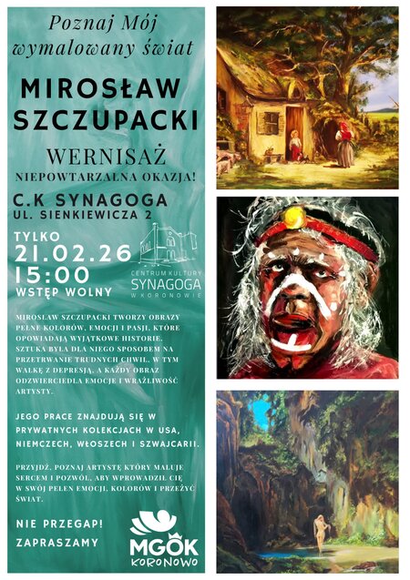 21 lutego 2026 roku o godz. 15.00 w Centrum Kultury Synagoga w Koronowie odbędzie się# wernisaż Mirosława Szczupackiego. Więcej informacji na plakacie.