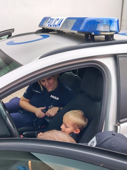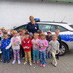 Kolejnym punktem wizyty była możliwość zaglądnięcia do środka radiowozu policyjnego i zobaczenie go z bliska. Dzieci z chęcią wsiadały za kierownicę samochodu i mówiły, że w przyszłości też zostaną policjantami.